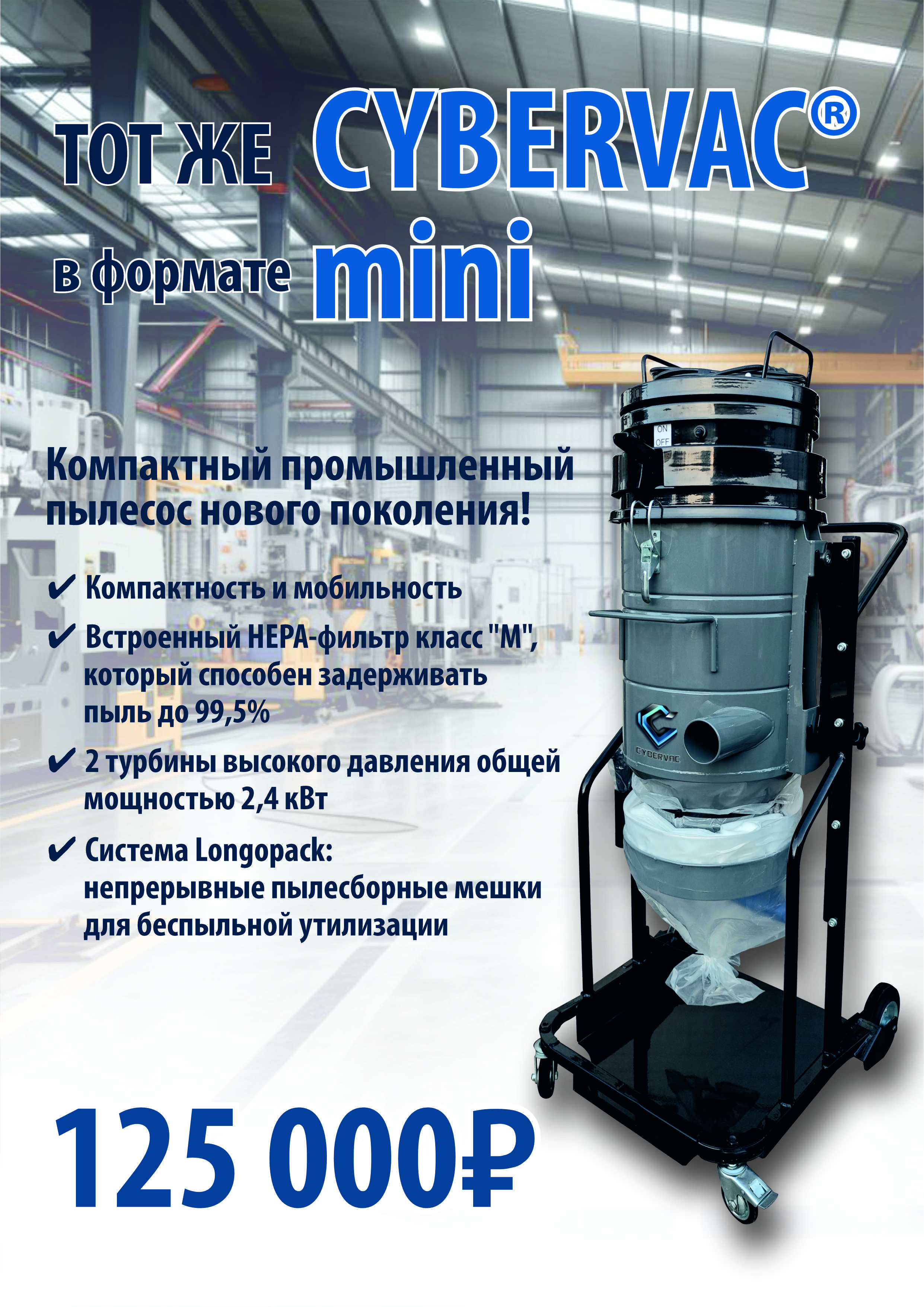 Промышленный пылесос Linolit® Cybervac® 3 Mini – профессиональное решение для сбора загрязнений класса «М»: бетонной и древесной пыли, шпатлевки, гипса и других сухих строительных отходов. Это самая компактная модель в линейке Cybervac, разработанная для работы в стесненных условиях без потери эффективности.